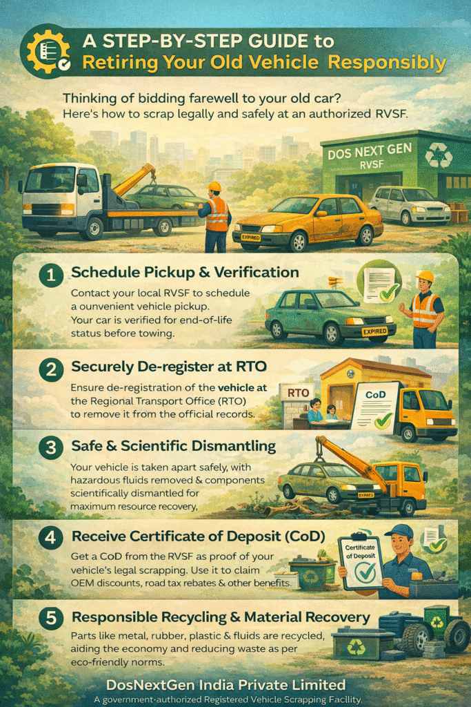 DosNextGen India Private Limited operates a government-authorised Registered Vehicle Scrapping Facility in Hapur (Delhi NCR), supporting vehicle owners across NCR states in transitioning responsibly. The process includes vehicle pickup, RTO de-registration assistance, and environmentally compliant dismantling.