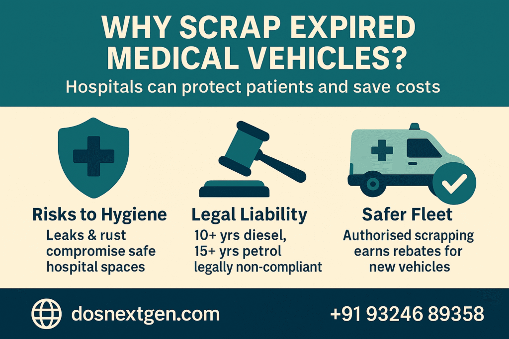 At Dos Next Gen India Private Limited, we have observed how outdated medical vehicles undermine not only legal compliance but also the very hygiene and operational standards that hospitals strive to uphold. Scrapping these vehicles is not just about regulation—it is a matter of protecting lives and ensuring trust in healthcare.
