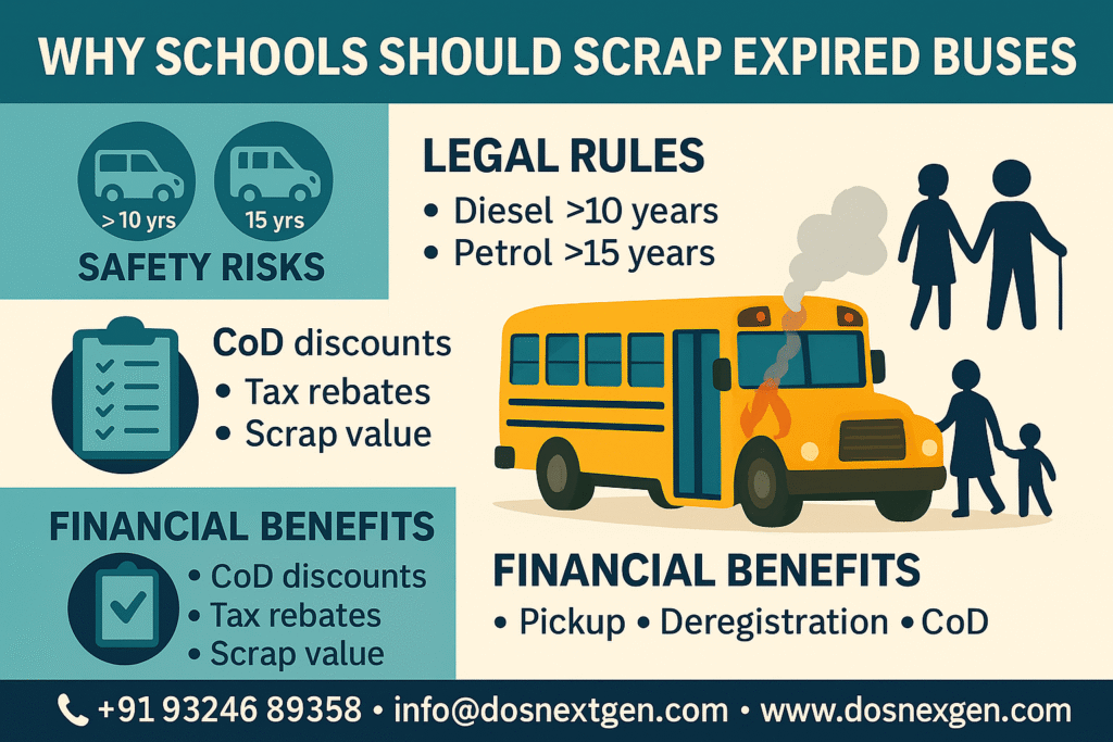 At Dos Next Gen India Private Limited, we have seen the risks of schools holding on to expired vehicles—risks that extend beyond legality to safety, environment, and financial stability. The truth is clear: scrapping outdated buses is no longer optional. It is the legal, safer, and smarter path forward.