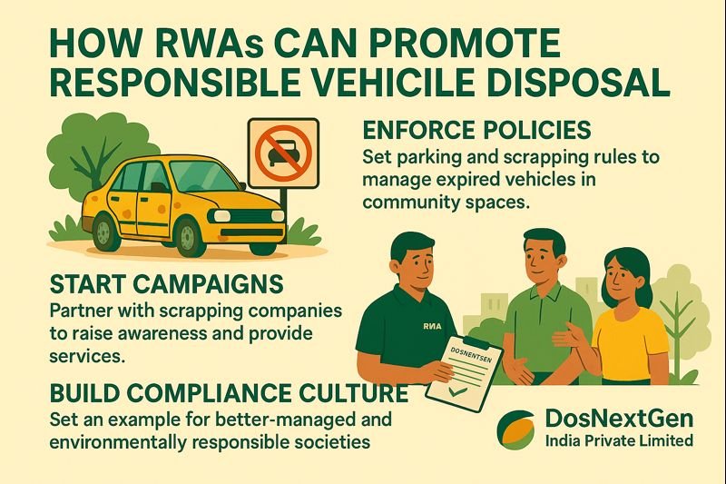Instead of waiting for enforcement drives, RWAs can initiate colony-level clean-up and scrappage campaigns. Partnering with DosNextGen India Private Limited, an authorised and government-approved scrapping company, RWAs can organise on-site assessments and awareness sessions for residents.