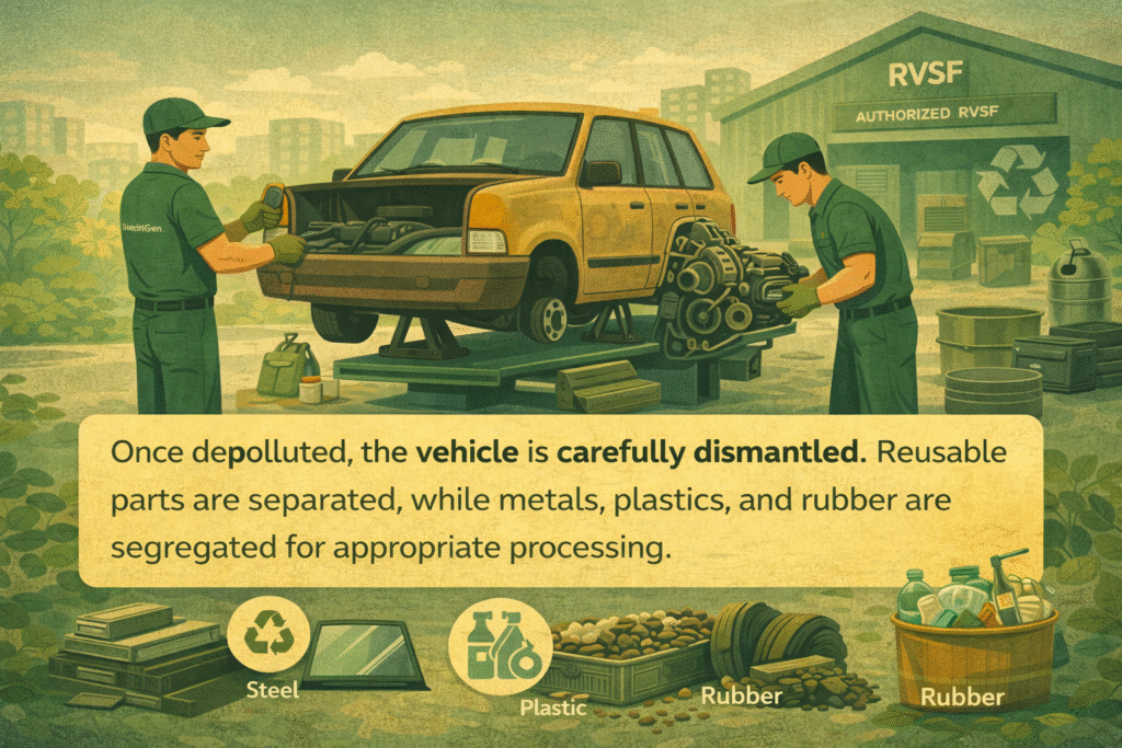 Once depolluted, the vehicle is dismantled systematically. Reusable parts are separated, while metals such as steel and aluminium are extracted for recycling. Glass, plastics, and rubber are also segregated for appropriate processing. This stage transforms what appears to be waste into valuable raw material for industry.