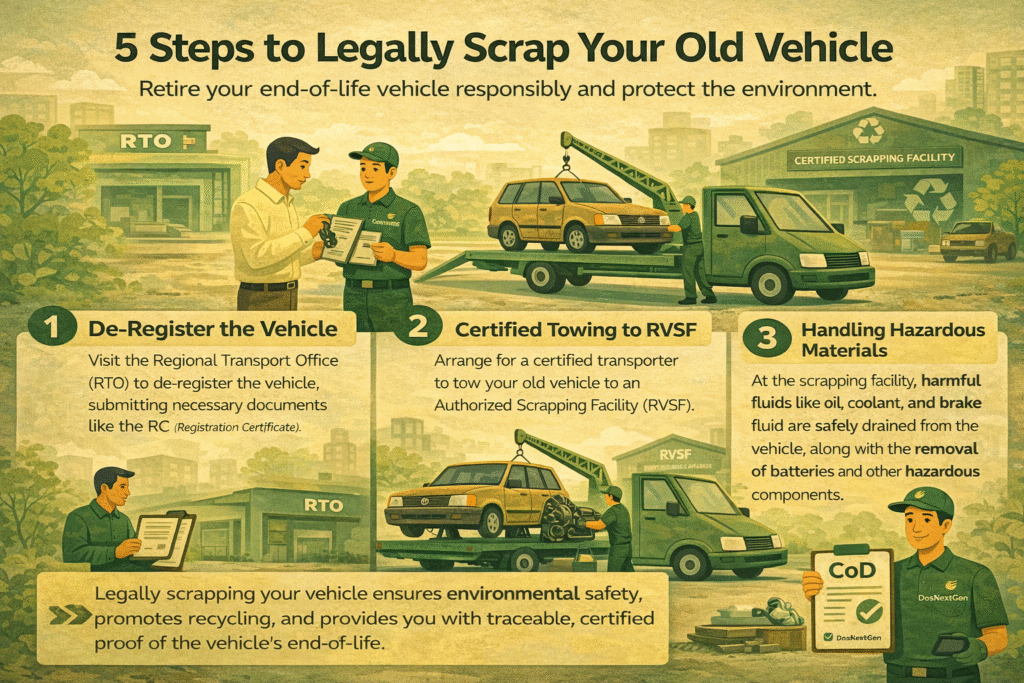 DosNextGen India Private Limited operates as a government-authorised Registered Vehicle Scrapping Facility, ensuring that every vehicle’s final journey is handled responsibly. From doorstep pickup and RTO de-registration to environmentally compliant dismantling and issuance of the Certificate of Deposit (CoD), the process is designed to be transparent, lawful, and sustainable.