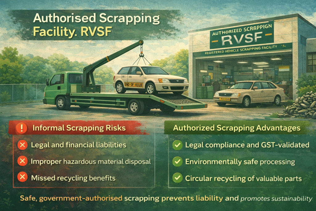 Under India’s Vehicle Scrappage Policy framework, End-of-Life Vehicles must be processed through government-authorised Registered Vehicle Scrapping Facilities (RVSFs). The process includes: