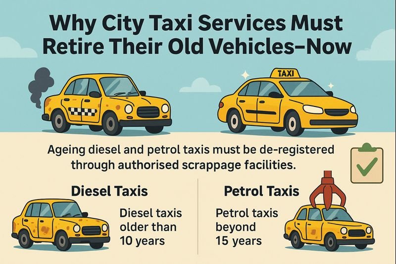 India’s city taxi services have long been the heartbeat of urban travel—swift, convenient, and always on call. But many of these vehicles, though still running, have quietly crossed their legal and environmental limits. Ageing diesel cabs and petrol sedans not only strain the air quality but also risk penalties, seizure, and reputation damage for operators who fail to comply with scrappage norms.