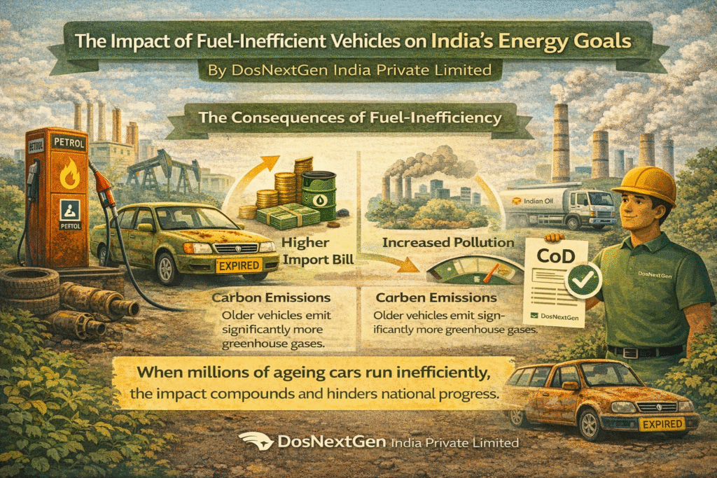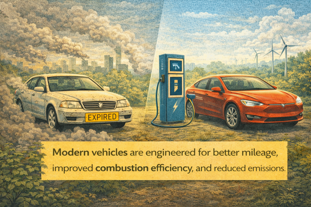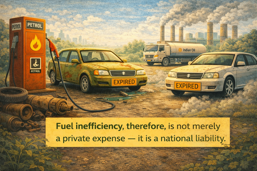India imports a significant portion of its crude oil requirements. Every additional litre of fuel consumed on Indian roads strengthens this dependence. Older, fuel-inefficient vehicles — particularly those built before stricter emission and efficiency standards — consume considerably more fuel per kilometre than modern alternatives.