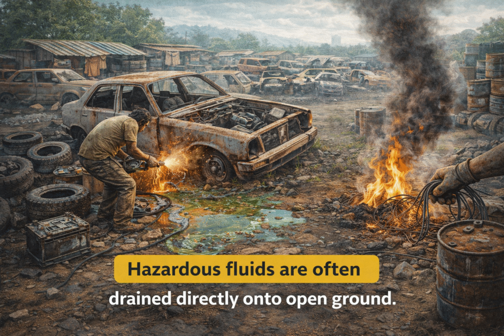 In many informal yards, dismantling is done manually, without structured de-pollution steps. Hazardous fluids are often drained directly onto open ground. Batteries may be broken apart without containment. Fuel tanks are cut without proper neutralisation.